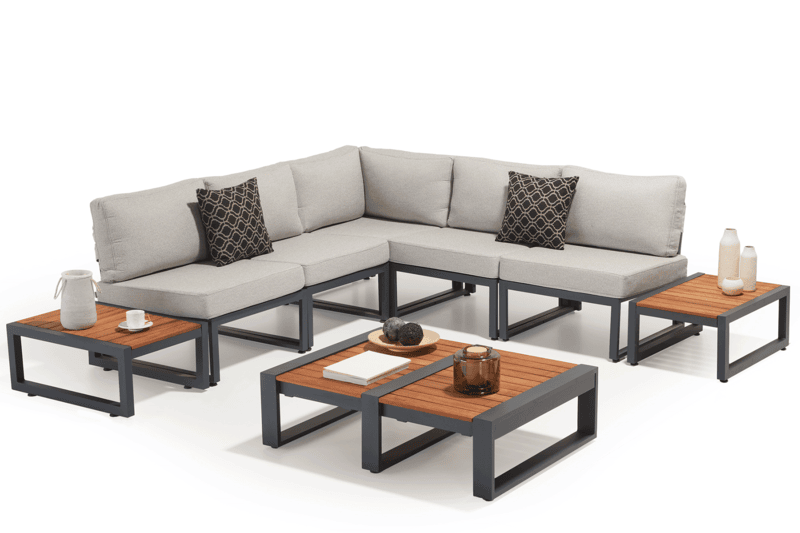 Set Contents: 5 Single Seats, 1 Corner Seat, 1 Coffee Table, 2 Side Tables