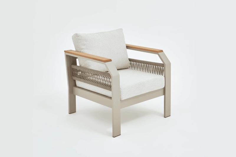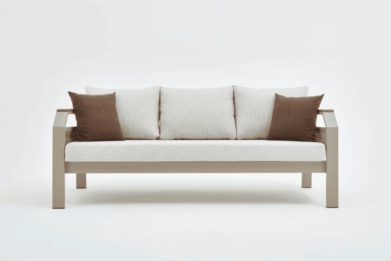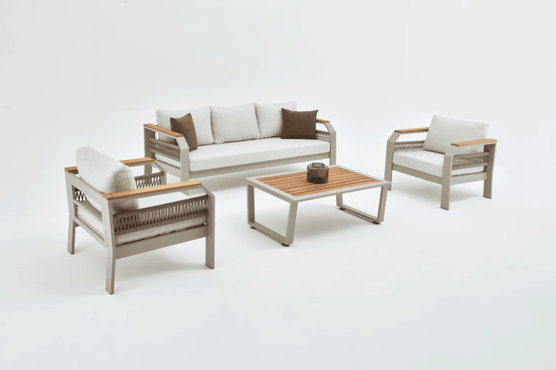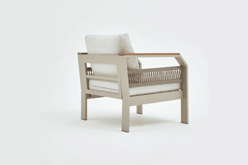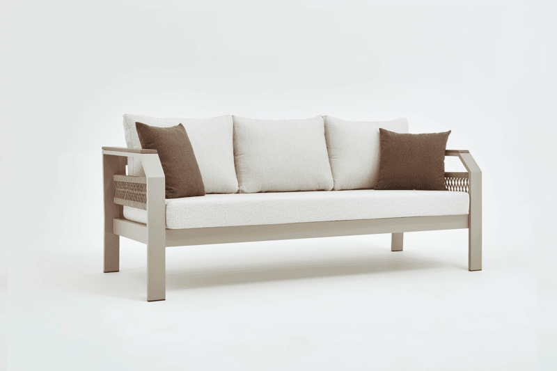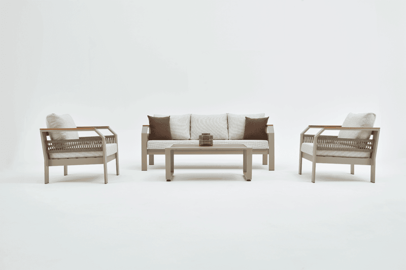 Our product is made entirely of aluminum. The fabrics are fade-resistant, water-repellent, and washable. Architectural-grade powder coating is used on our products, which also have UV resistance. The cushions are zippered, making cleaning easier. Due to these features, our products are ideal for use in gardens, balconies, and terraces, and their stylish design makes them equally suitable for indoor spaces.