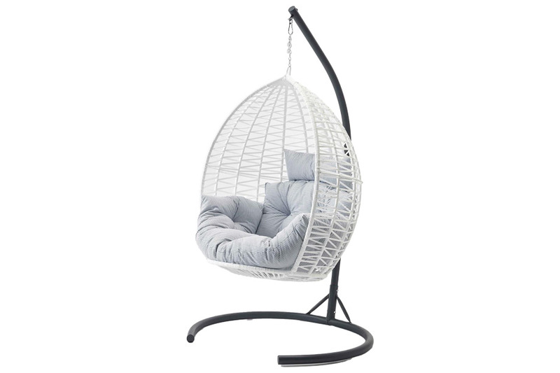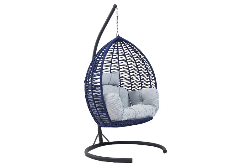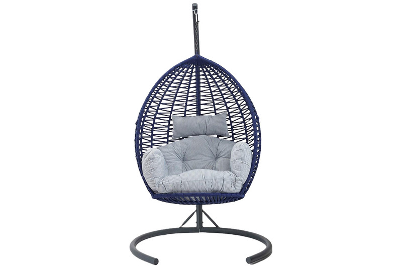 Description: The Saka single-seat cage swing is a unique example of ergonomics and innovation. Its navy blue cage weave and navy striped silicone cushions blend seamlessly into any environment. The durable metal frame is coated with electrostatic powder paint. It is not recommended for prolonged exposure to water. The swing is shipped dismantled.