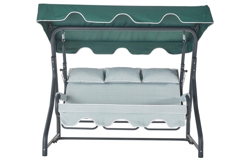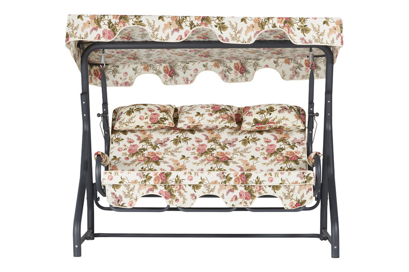 The Salvia model 3-seater swing is designed for long-lasting comfort with a steel bearing for noiseless operation and enhanced durability. It features a reclining mechanism and special footrest slides for extra comfort. It also includes headrest pillows. The swing is supported by sturdy Ø60 mm pipes, ensuring durability and a robust appearance.
