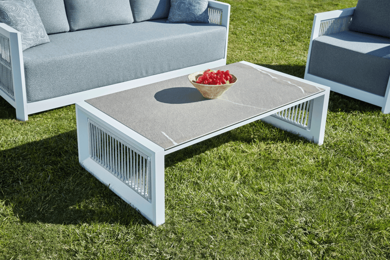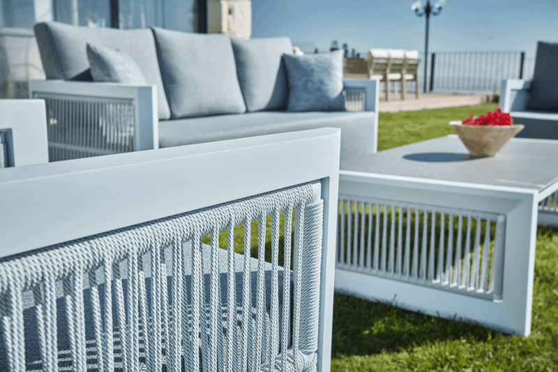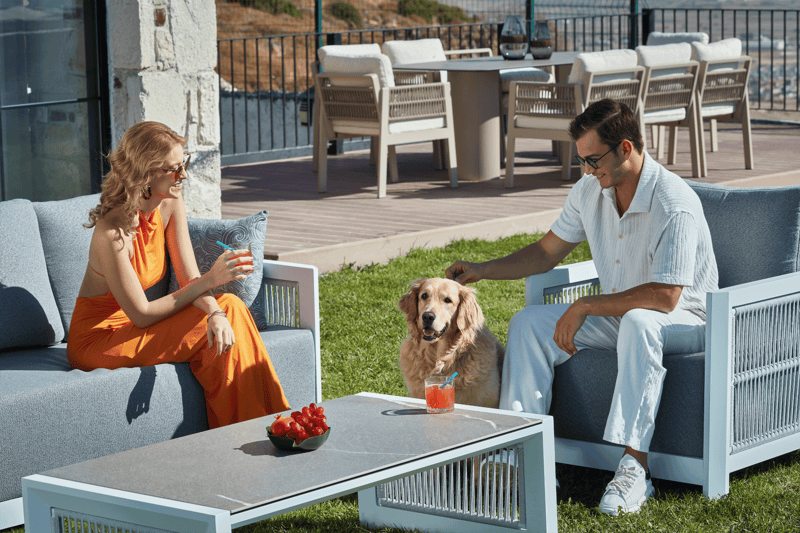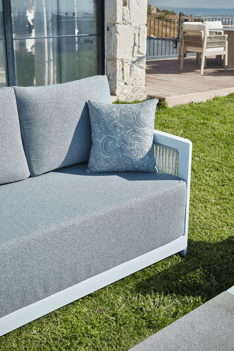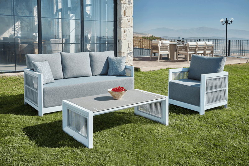 Our product is made entirely of aluminum, making it rust-free and suitable for year-round use. It is unaffected by sunlight and water. The fabrics come with fade-resistant and water-repellent properties and are washable. Architectural-grade powder coating with UV resistance is used on our products. The cushions are equipped with zippers for easy cleaning. The seat cushions contain pocket springs, while the back cushions are filled with fiber and bead silicone for added comfort. Due to these features, our products are ideal for gardens, balconies, and terraces, and their stylish design makes them equally suitable for indoor spaces.
